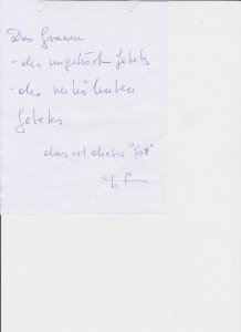 oder ob ich die Zartheit UND DIE GEWALTIGE KRAFT NÄMLICH!!, habe, es zu lieben, dieses Raumlied wandelnd mitzuwerden.. also ob ich mich durch Raum trabe.. HÖREND mit den Ohren, sehend MIT DEN AUGEN, wahr NEHMEND, und das dann noch raffend, in WeisheitGESCHMEIDE zum Herzeigen…